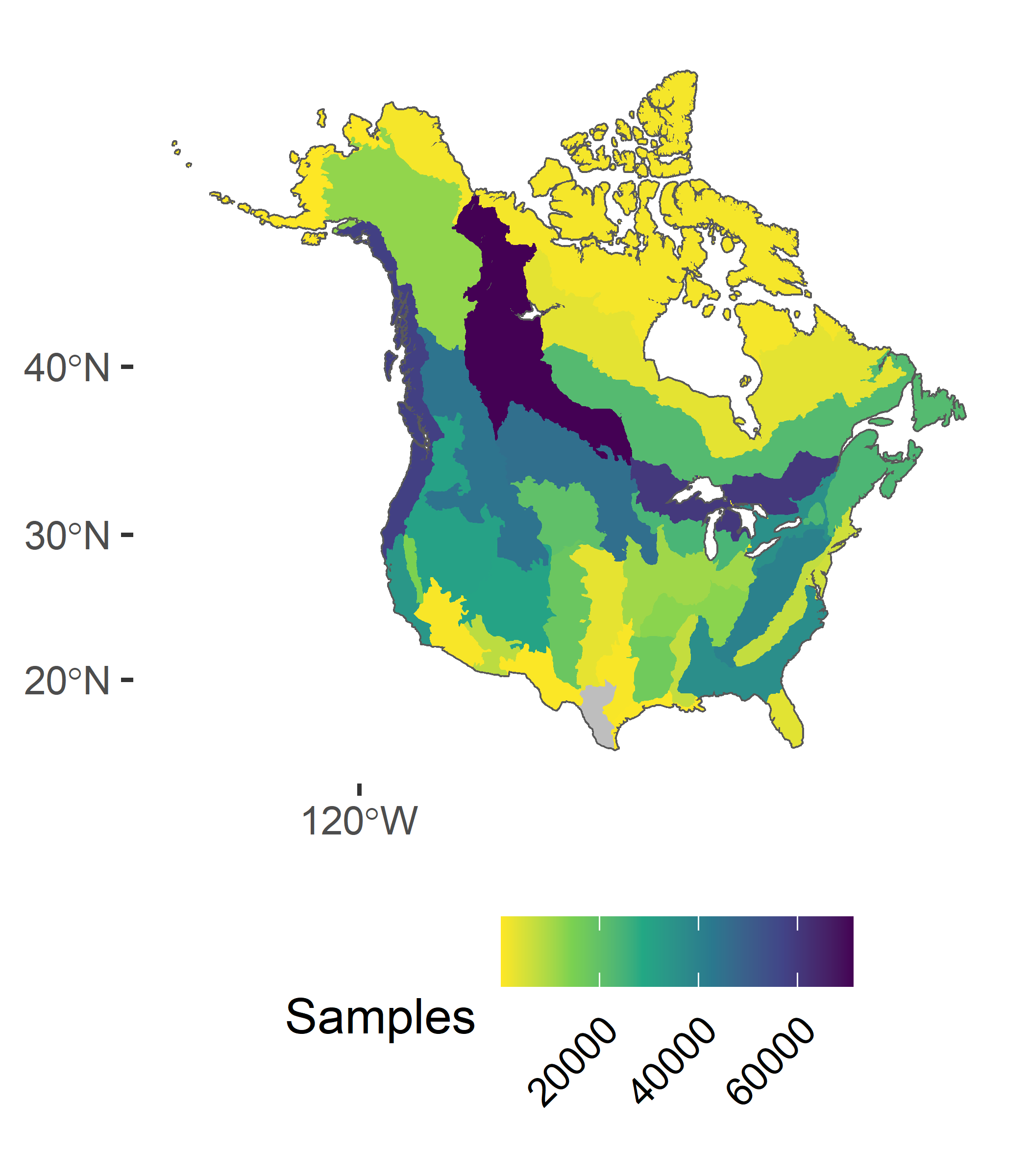 To date, we have observations covering much of North America, but there are some notable gaps in our coverage in the Southern United States, the far north, and Mexico (Yellow and Gray areas).